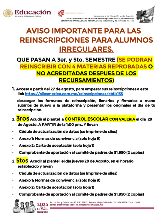 Aviso General para Reinscripción de 3ros Irregulares 25-1 con 4 UAC Reprobadas